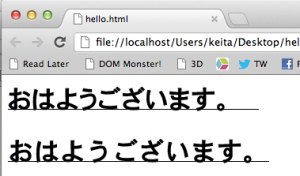 The top line has text-rendering: optimizeLegibility; applied, and the bottom line use the browser defaults. As you can probably tell, optimizeLegibility has indeed optimized the legibility, and the type looks much nicer. However, there is a fatal bug in rendering Japanese characters with optimizeLegibility: It seems that the actual optimization is taking place after the length of the line is calculated. As you can imagine, this is a problem. Here’s a screenshot with an underline applied: