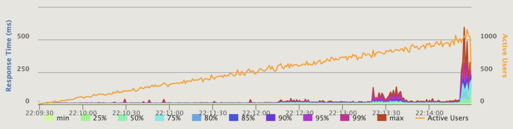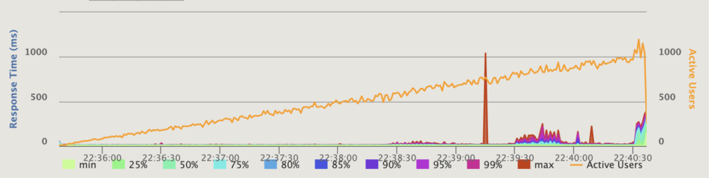 In this test, I wanted to try out a few configurations that mimic characteristics of applications I’ve worked on: short and long requests, usually IO-bound. A short request is defined as just rendering a simple HTML template. A long request is 300ms. The requests are ramped from 1 request/sec to 1000 requests/sec over 5 minutes.