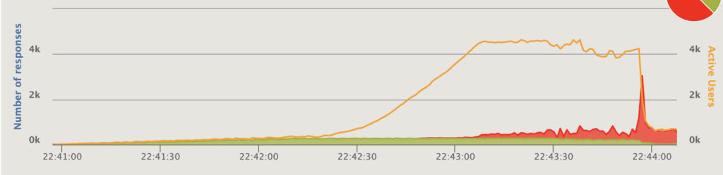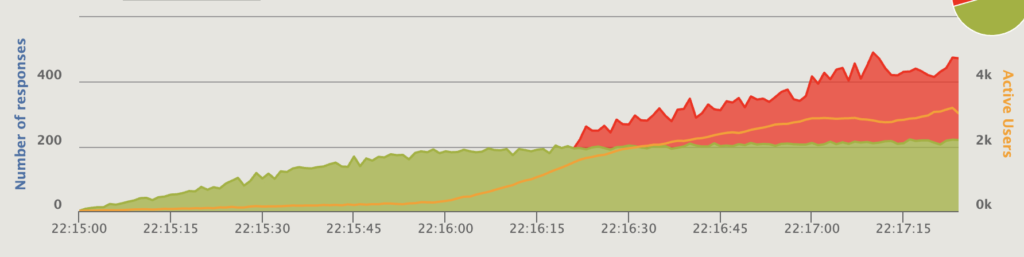 Number of responses per second (green OK, red error), 300ms response — 4 instances, 20 threads each, using Nginx.